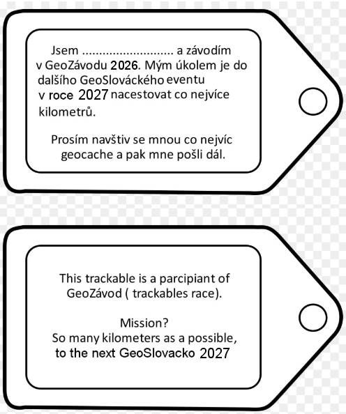 Jsem ……………………… a závodím v GeoZávodu 2026. Mým úkolem je do dalšího GeoSlováckého vyhodnocovacího eventu v následujícím roce nacestovat co nejvíce kilometrů. Prosím navštiv se mnou co nejvíc geocache a pak mne pošli dál.